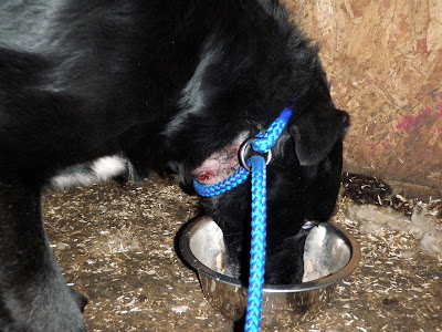 He is in reasonable shape, considering his ordeal, his back legs are small, lacking muscle from being shut in. As I picked him up to put him in the car there was a terrible smell, and blood, something was really not right. The poor pup had been put in a collar a long time ago and had grown, the collar didn't grow with him but instead of choking him became part of him, the buckle scabbed and furred over as his body was trying to heal over the wound. He came to Rock HQ via the vets where the collar was cut off, good taste prevents the description of the leather flesh fur combination around the metal work, the smell made us heave, he was shaved, cleaned, given antibiotics, a wormer and flea treatment. As we had no idea of his temperament he was muzzled during this whole process. What did he do? He stood still, looked into my eyes most of the time, tried to lick my hand through the muzzle and, unbelievably, wagged his tail. This poor dog, a victim of such abuse, was willing to place his trust in three unknown adults to make things right. He's now in the stable on the cosiest bed ever, 12 sheep fleeces. A light supper of softened biscuits, dog meal and goats milk was gratefully received and we have left him to sleep if off with a toy tiger and a ball that he happily chased around. Boris, as he is now known, will make someone a wonderful dog, and he deserves some wonderful people to take him on.